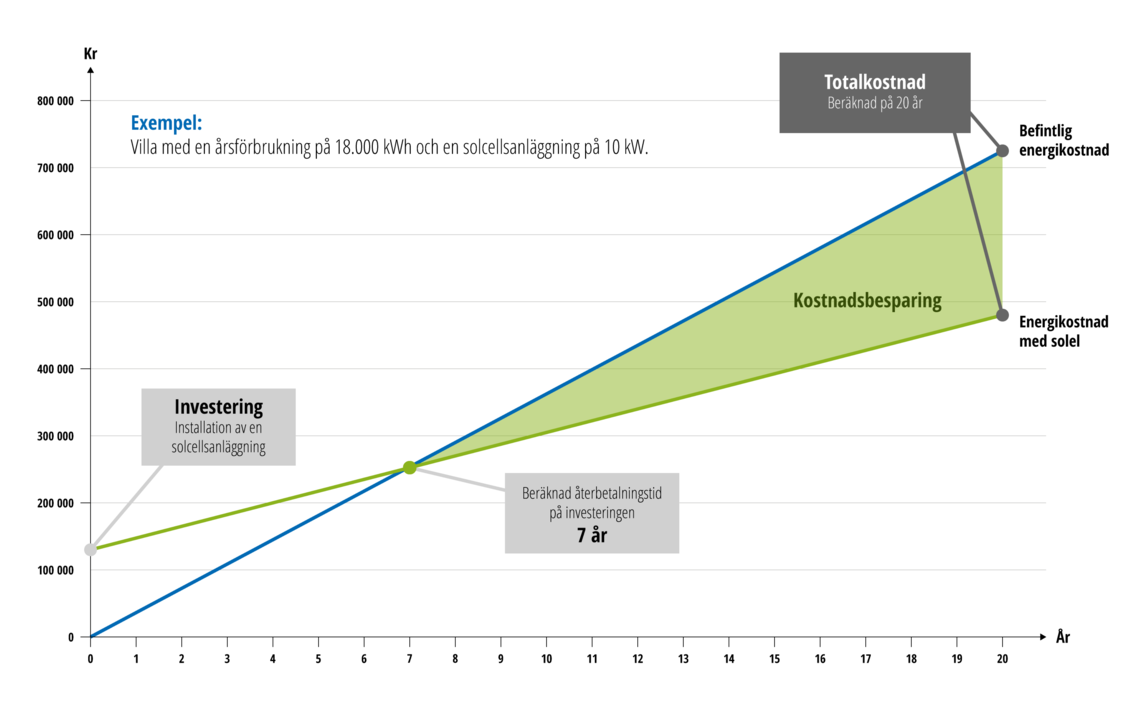 Bild. En solcellsanläggning på 10 kW installerad på en villa med en uppskattad årlig elförbrukning på 18 000 kWh. I exemplet har vi räknat med en investeringkostnad på 129.000 kr inkl 20 % skattereduktion samt ett rörligt elpris på 2 kr/kWh inkl påslag och avgifter. Vi har även räknat med att solcellsanläggningen producerar 9000 kW och att 50 % används och 50 % säljs ut på elnätet.
