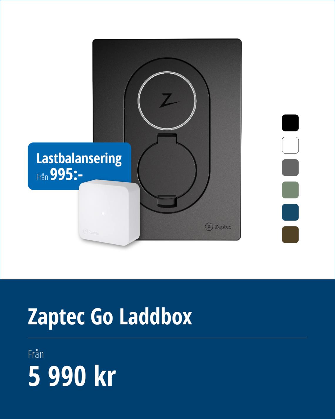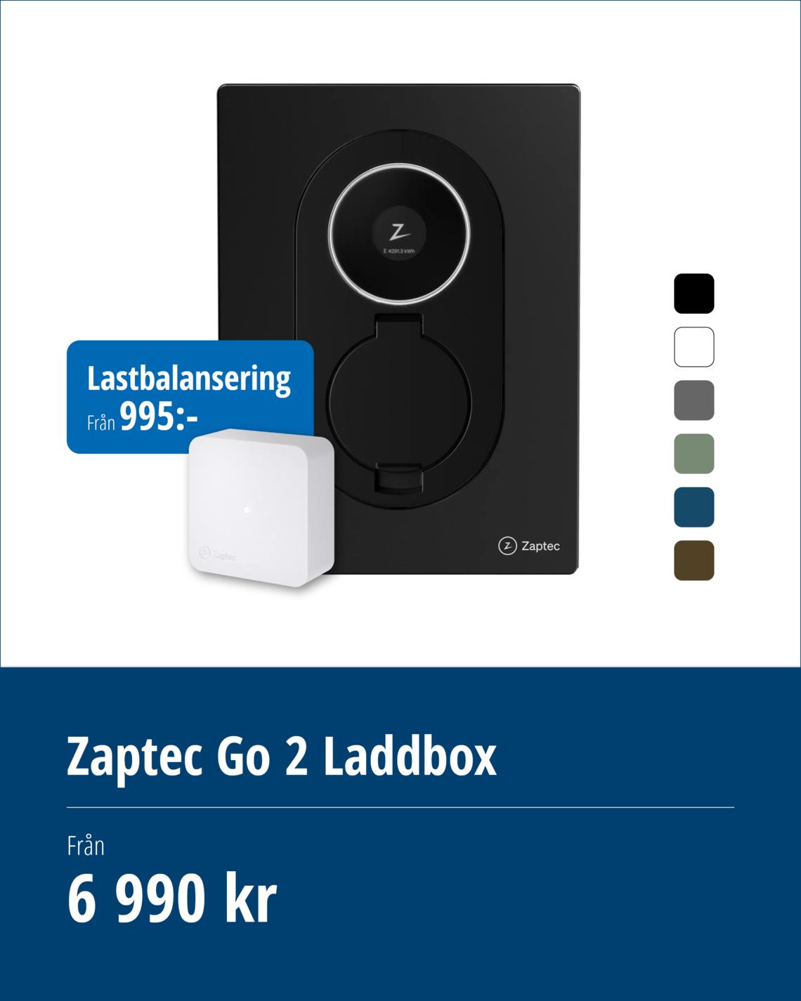 Zaptec Go är en av marknadens minsta laddboxar, passar alla laddbara elbilar och levererar upp till 22 kW. Zaptec Go är alltid uppkopplad med WiFi och 4G LTE-M för att du ska ha tillgång till de senaste funktionerna och uppdateringarna. Laddboxen är certifierad och har ett inbyggt DC-skydd men måste kompletteras med en Typ A jordfelsbrytare.