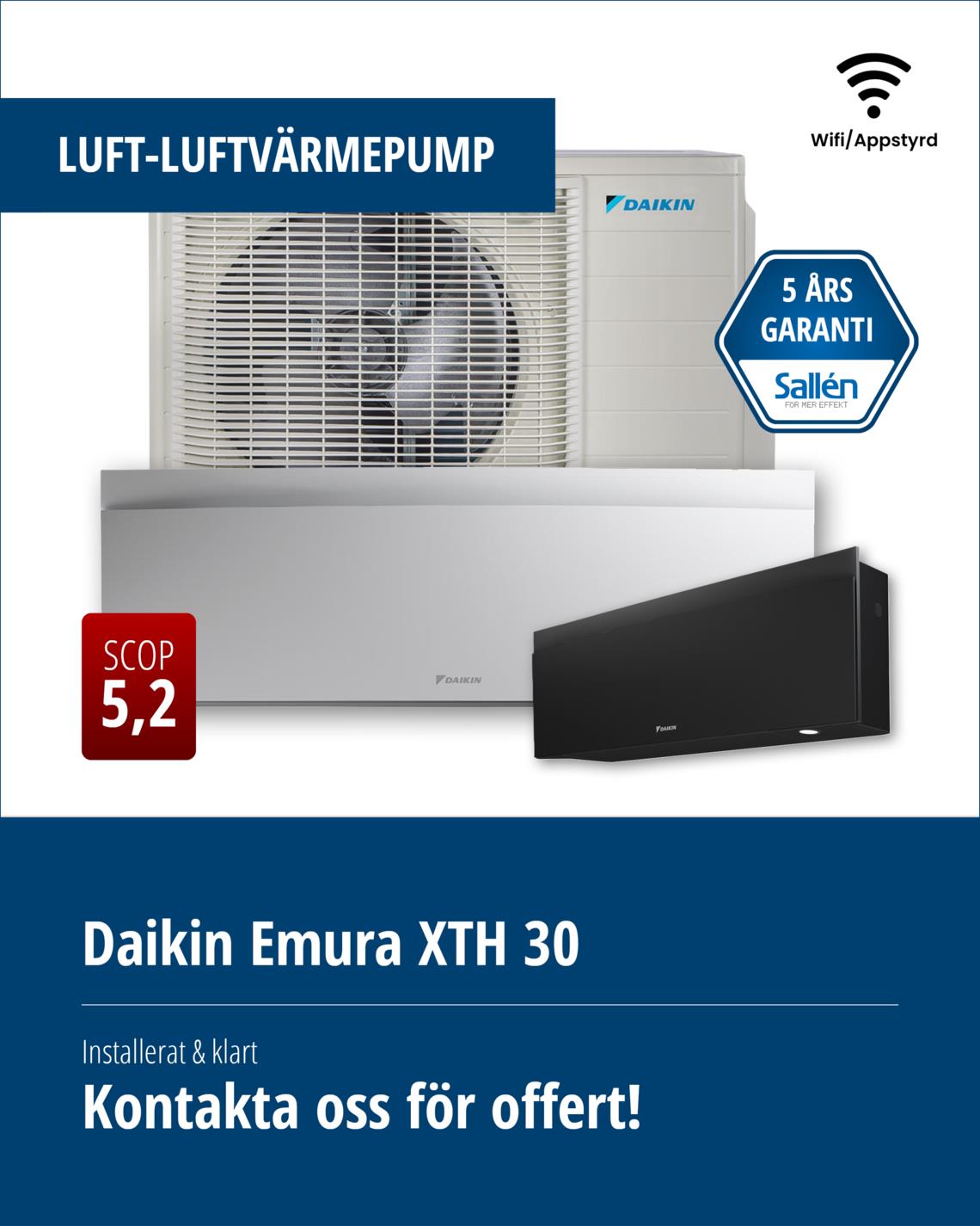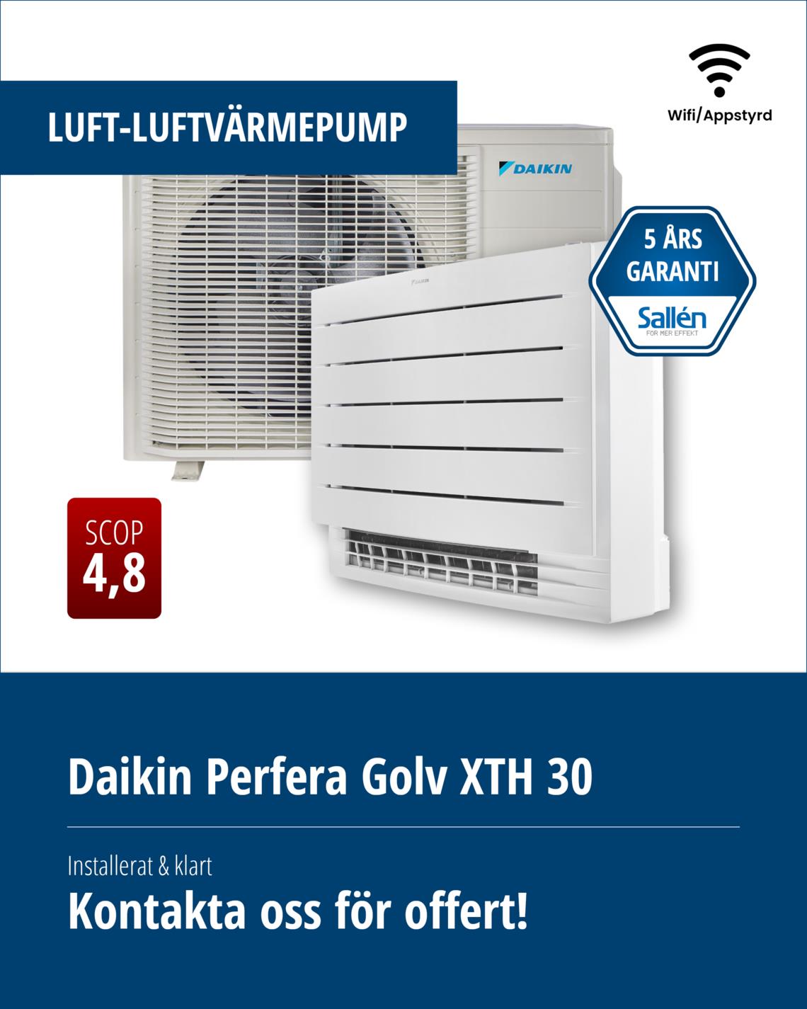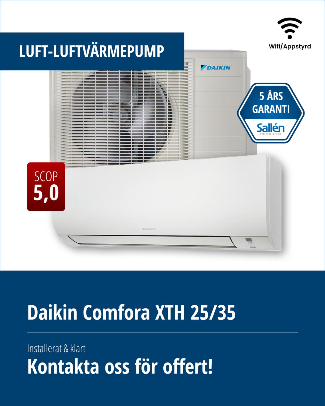 Vi erbjuder installation, felsökning och reparation av luftvärmepumpar från Daikin. Med en luftvärmepump från Daikin får du modern energieffektiv lösning för värme och kyla. Värmepumpsteknik använder till nästan 80% förnybar energi för att ge dig ett perfekt inomhusklimat. Det är hållbart för miljön och bra för din plånbok..