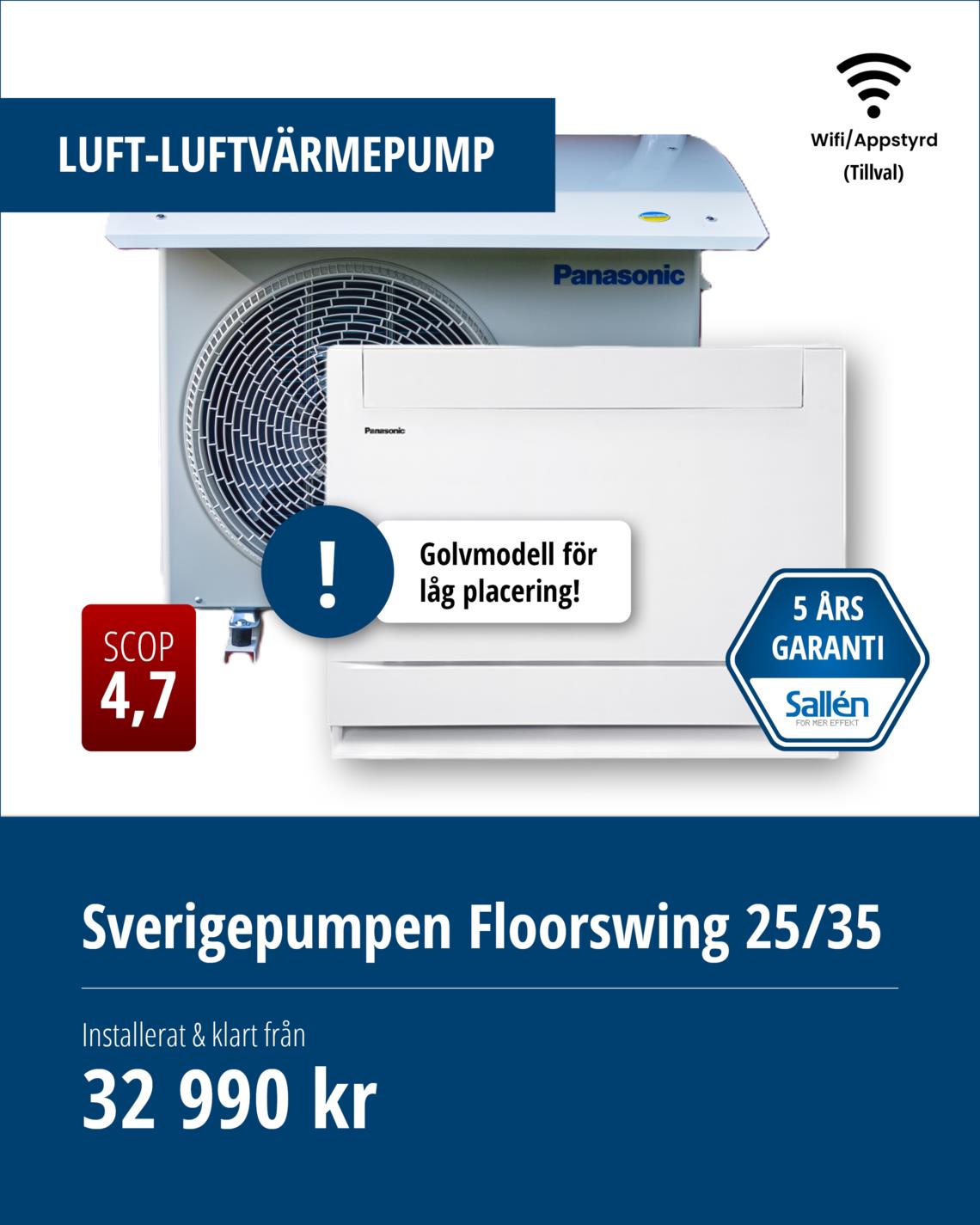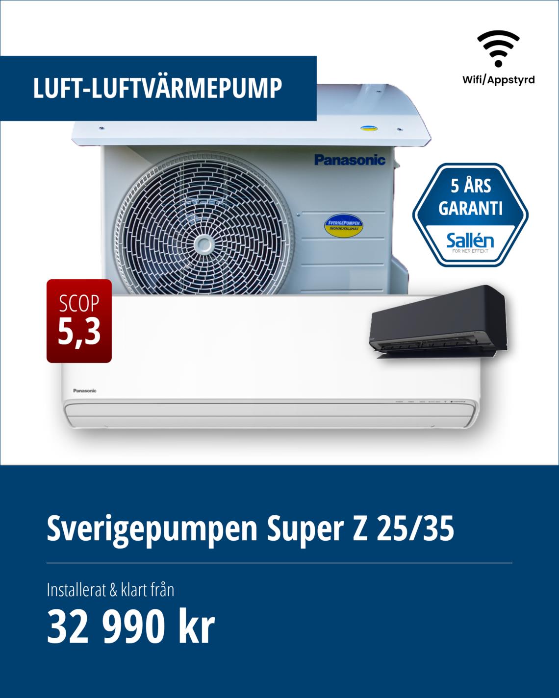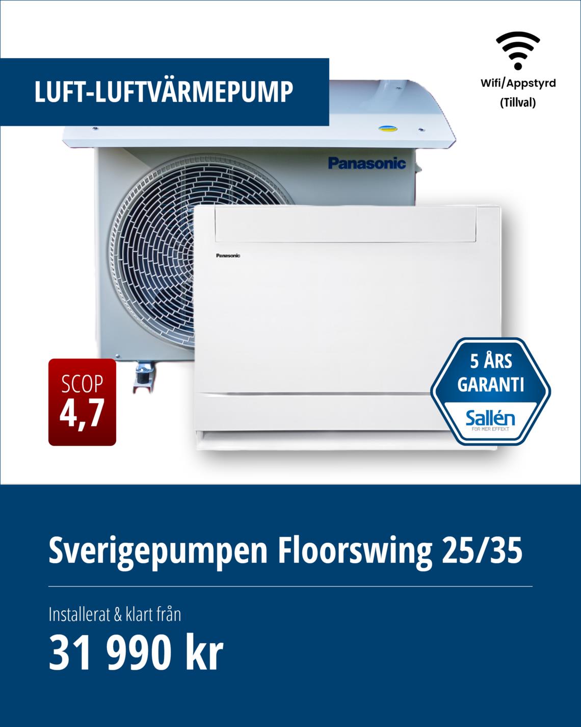 Vi erbjuder installation, felsökning och reparation av luftvärmepumpar från Panasonic / Sverigepumpen. Sverigepumpen erbjuder energieffektiva luftvärmepumpar som kan sänka dina energikostnader rejält och förbättra inomhusklimatet. Dessutom får du alltid minst 5 års trygghet (garanti + försäkring), vilket gör det till en trygg investering!